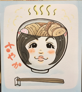 最初に司会の方のリクエストで、「顔をラーメンにして描く」という面白いリクエストにお応えしてお描きしたところ、続く皆様も「動物に変身させて描く」という感じになり、たくさんの面白い似顔絵が出来上がりました。